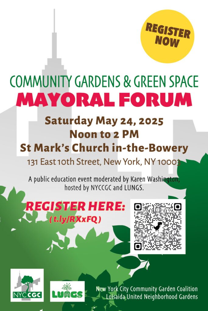 LUNGS is a network of 50 community gardens on NYC’s Lower East Side. LUNGS membership is made up of the gardens themselves. In 60s and 70s the City allowed fires, destruction and neglect to wreck the Lower East Side. Collapsed buildings became vacant lots and the people converted those lots into community gardens. So out of that official urban blight the gardens grew and the result now is that Loisaida has the greatest density of community gardens in the country.