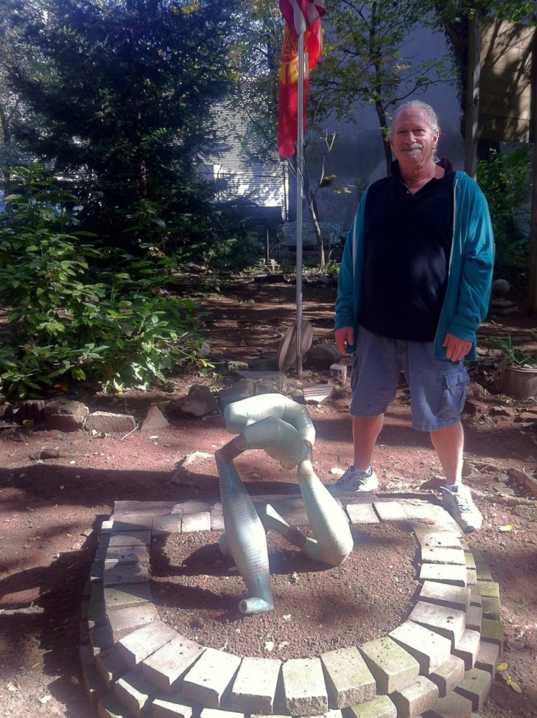 After exhibiting his work in the Firemen’s Memorial Garden during the “Harvest Arts Festival in the Gardens”, sculptor Peter Goldwater generously decided to give “Waterworks #3” to the garden. The sculpture is a ceramic casting of intermingled FDNY fire hose nozzles. Peter presented his work to The Firemen’s Memorial Garden on October 20. The garden is located on East 8th St between Avenues C and D. A plaque commemorating the gift and a celebration is planned in the garden next summer.
